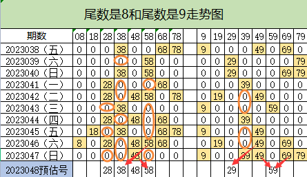 本期这个尾数号码走势多为空期走势,号码28,38,5878,,68都有空期走势,最为