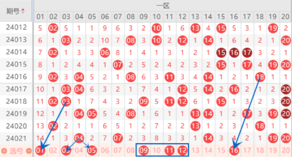 该区间的03号数字是属于空三对称的号码,本期我们注意一下出号的可能。上期开出了07号数字,本期我们注意一下05 09号数字同出的情况。本期的09 11 12号数字我们要重点关注了,这里是有机会出两个号码的,可以重点关注一下09 12号数字的出号情况。本期的16号数字我们注意一下,属于三斜连号码,出号机会还是有的。本期的17号数字我们可以重点关注一下,交叉对称号码上期出了19号数字,那么本期的17号数字是哟很大可能要回补的。