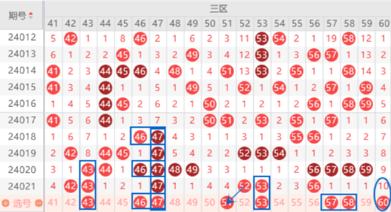 上期开出了42 43号数字的连号,本期我们注意一下出一个重号的情况。本期的46号数字我们注意一下,属于V型号码,出号机会还是有的。本期的47号数字我们防守一下出现5重号的情况。本期51 52号数字我们注意一下回补一个号码的情况。四连号56 57 58 59上期开出了56号数字的重号,那么本期我们就要注意一下57 58 59落下一个号码的情况,其中的59号数字我们可以丢了,重点关注一下57 58号数字出一个号码的情况就行了。本期的60号数字是属于遗漏10期的号码,本期我们注意一下出号情况。