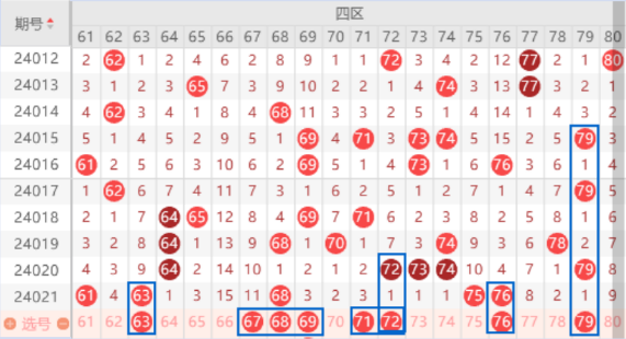 该区间上期开出了61 63号数字,那么本期我们注意一下出一个重号的情况,重点关注一下63号数字的出号情况。本期的交叉对称号码69 71号数字我们要做一下防守了,本期是有机会出一个号码的。三连号72 73 74号数字上期没能出现重号,本期我们注意一下落下一个号码的情况,重点关注一下72 74号数字的出号情况。上期开出了75 76号数字,本期我们注意出一个重号的情况。本期的79号数字是属于121走势,我们关注一下出号情况。