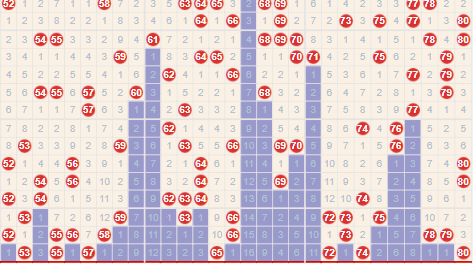 根据上面的研究咱们看一下目前的趋势哪里符合咱们讲的这种,这里要提及一下,一定要多研究几期,看看范围型冷号大概是在遗漏多少期之后或者整体断区多久才集体发热的。通过观察我们发现36到50这个区间之前比较热,然后开始变冷,甚至变成极冷门。目前已经进入一个转换期,这个时候我们就要注意了。其实你注意观察就会发现,如果我们把80个号码分成几个区的话,开奖号码都是在不同的区间之间转换,最终还是要完成冷热交替。毕竟快乐八程序也是人编出来的程序,只要你想研究,没准哪一天跟程序重合了,恭喜你。你就是下一个百万富翁了。
