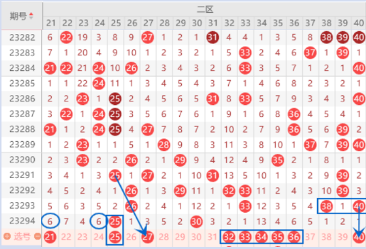 本期的21号数字我们要关注一下,出号机会还是有的。本期的25号数字我们要注意一下走重的情况,毕竟上期的14-25号数字之间断号了,本期13 14 25应该会出现一个重号的。本期的27号数字我们也是要关注一下,中心对称号码上期回补了25号数字,那么本期就有可能会回补27号数字的。本期的32 33 34 35 36号数字我们要注意一下,这里有可能会出现假四连号码,可以重点关注一下的。连号空一带号38 40 41上期没能出现重号,那么本期我们就要注意回补情况了。