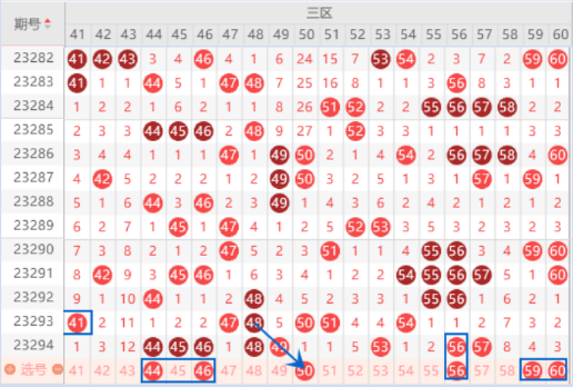 上期开出了三连号44 45 46号数字,本期我们要防守一下出重的情况,重点关注一下44 46出重的情况。本期的50号数字我们做一下防守就可以了。上期开出了连号56 57号数字,那么本期我们就要注意出重的情况了。本期的59 60号数字我们也是要做好防守的,毕竟空几期就出一次59 60号数字,本期还是有机会出来的。