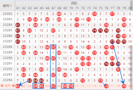 本期的61号数字是属于遗漏7期的号码,遗漏7期的号码我们重点考虑一下61 79的出号情况就可以了,其他号码应该可以丢了。三连号63 64 65本期我们也是要注意出现重的情况的,重点关注一下64 65的出哈情况就可以了。本期的67号数字是属于121走势,我们做一下防守就行了。本期的70号数字我们也是要防守一下,出号机会还是有的。上期开出了75号数字,本期我们要注意分边的情况,重点考虑一下76号数字的出号情况。