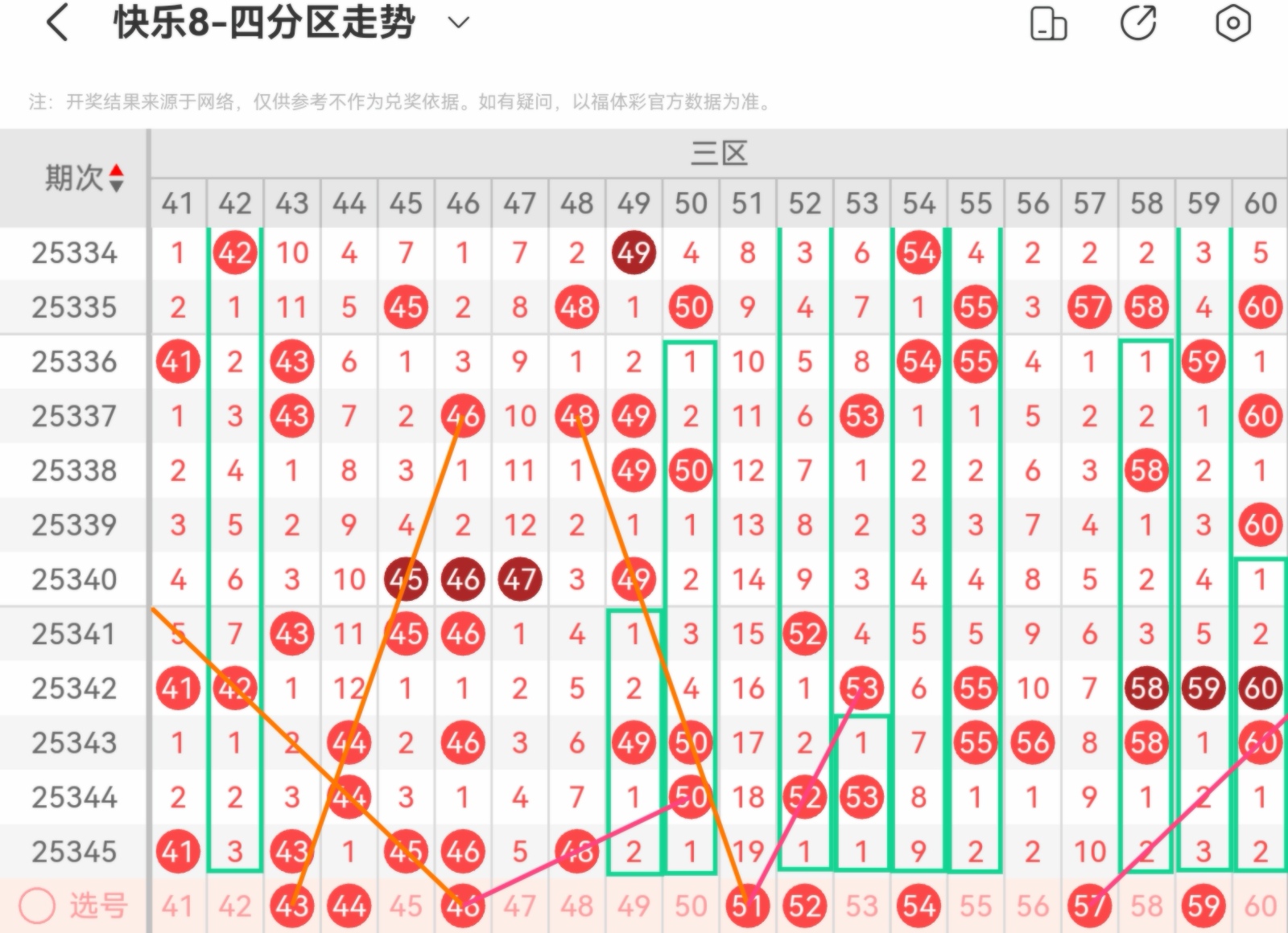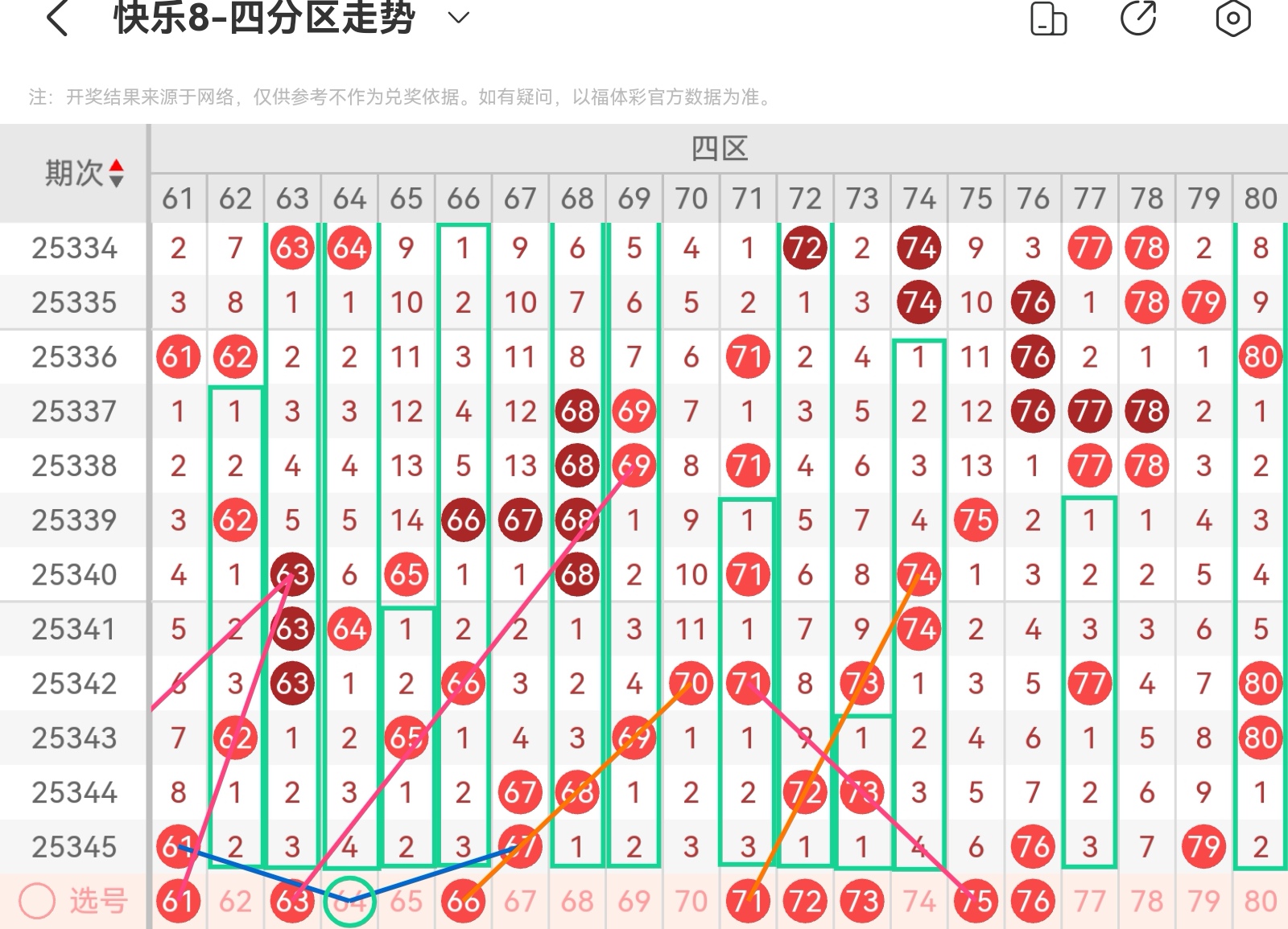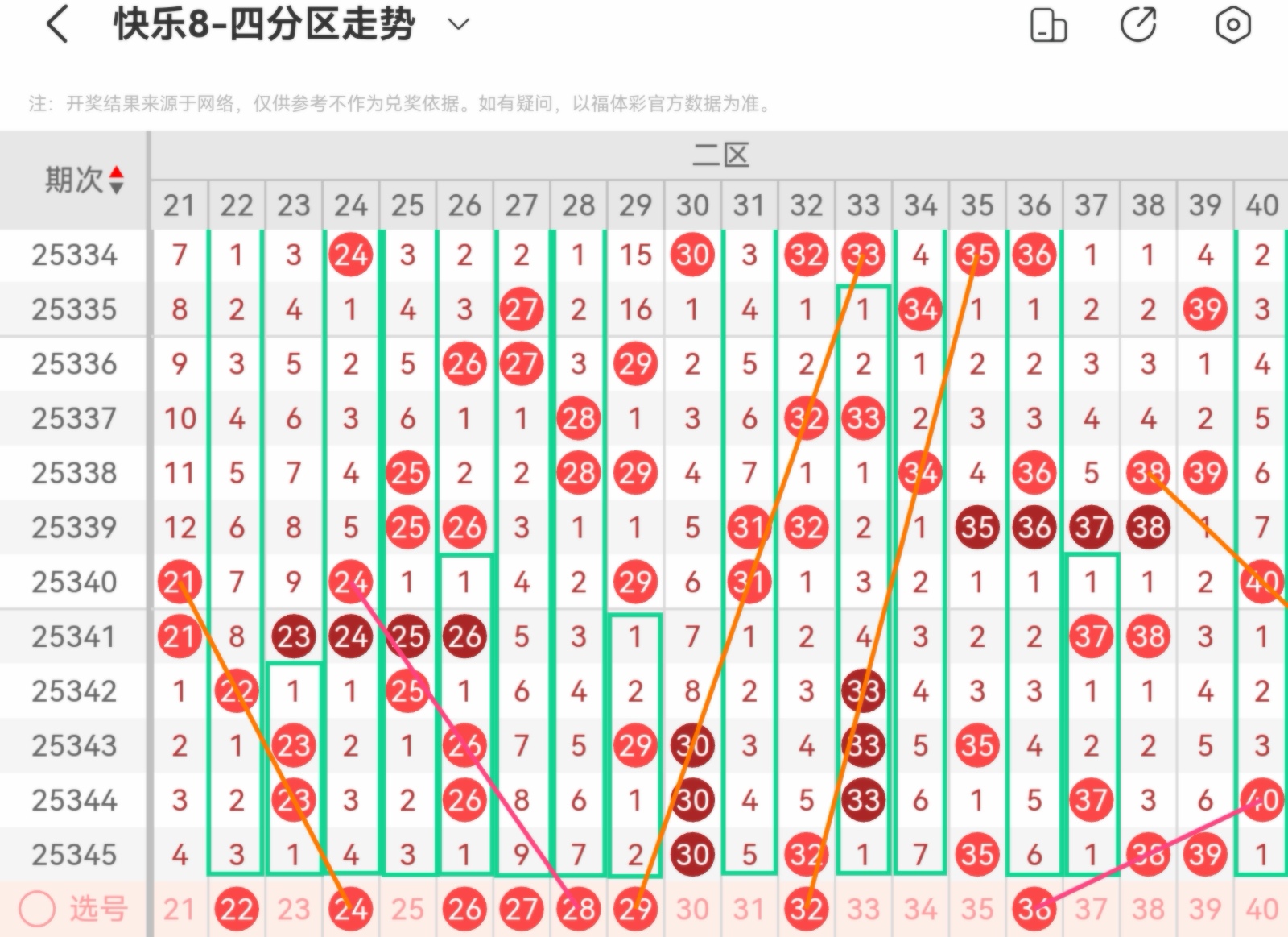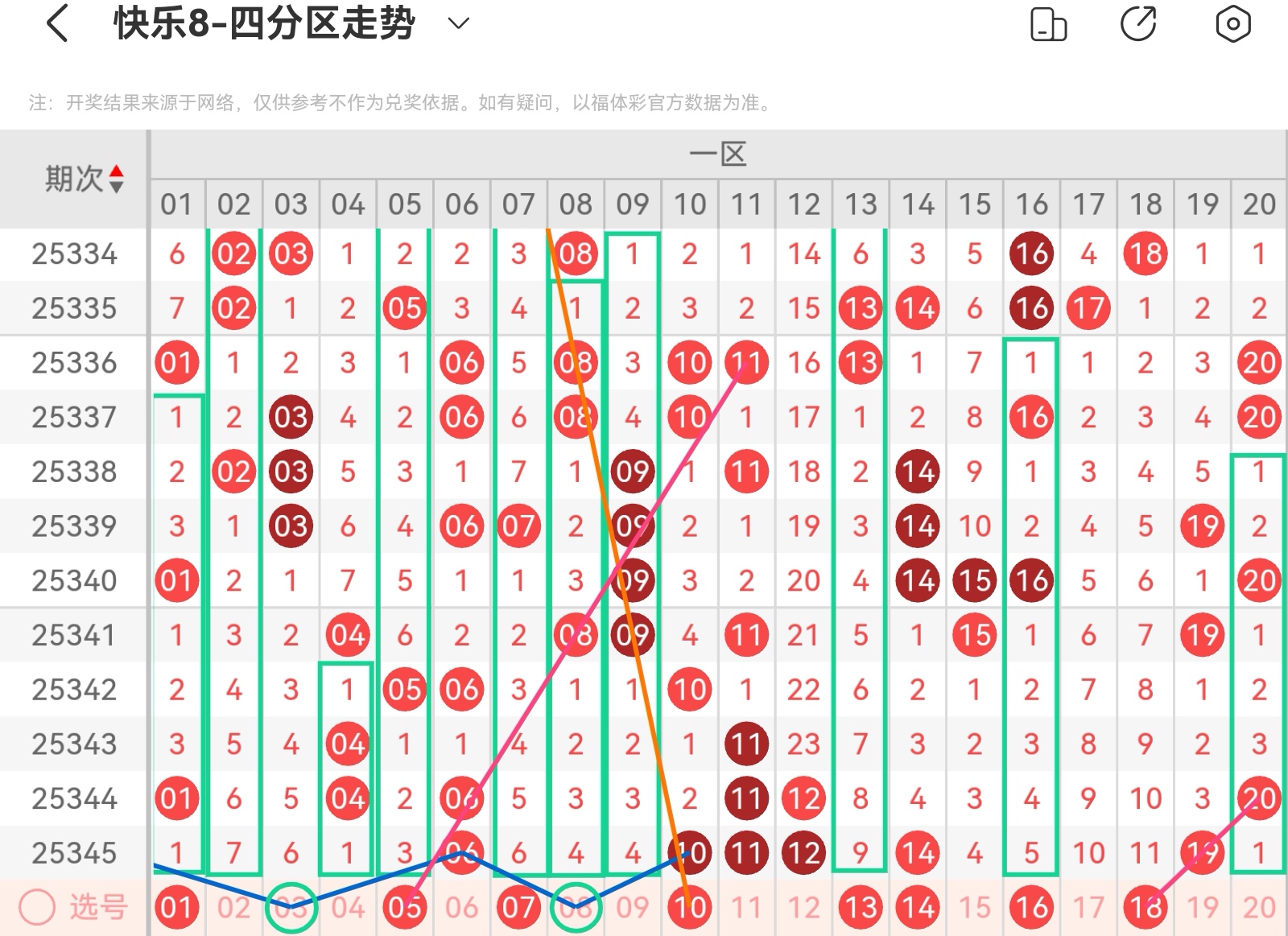 大家好,我是甜丝丝的坏事,主要以快乐八的形态走势、空位走势、遗漏走势以及斜连走势相结合的方法,用公认的四分区走势来进行预测分析,希望能让你有所收获。