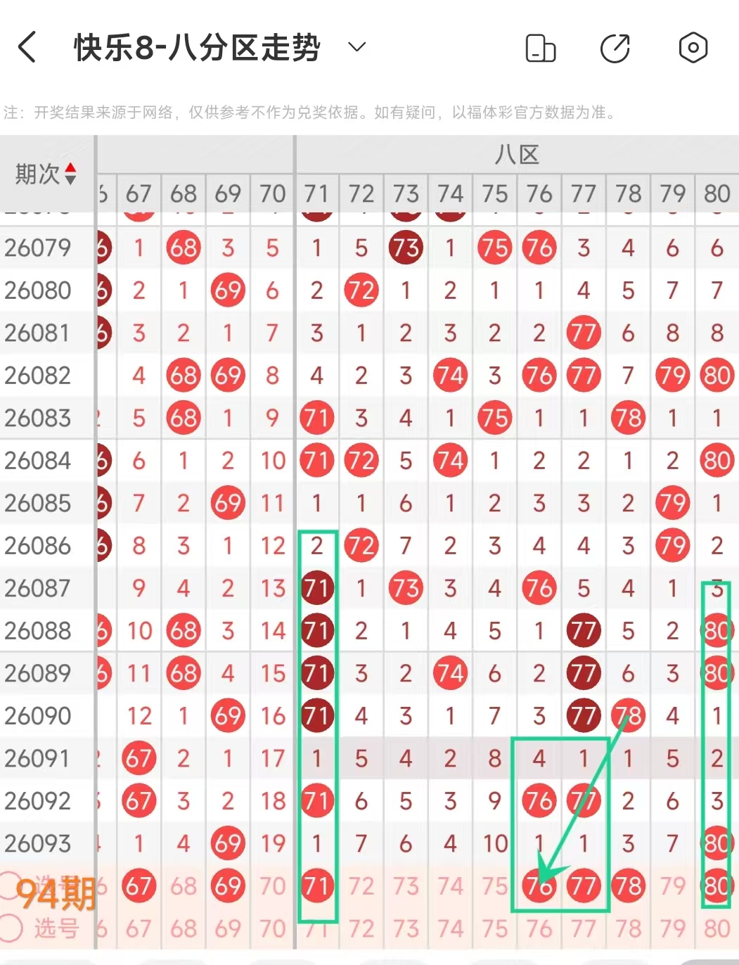 上期八区开出80这1个号码, 本期可以考虑2个左右