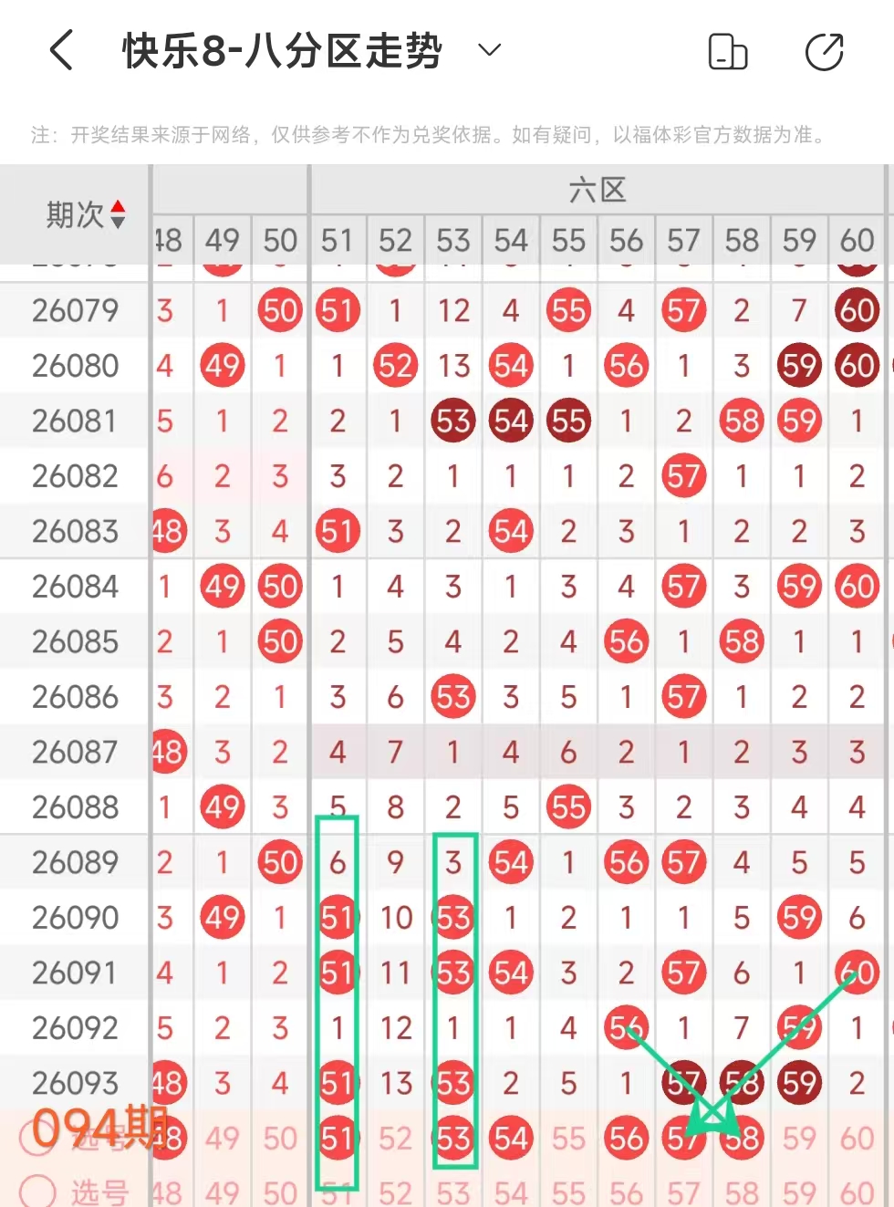 上期六区开出51 53 57 58 59这2个号码,本期应该出3个。