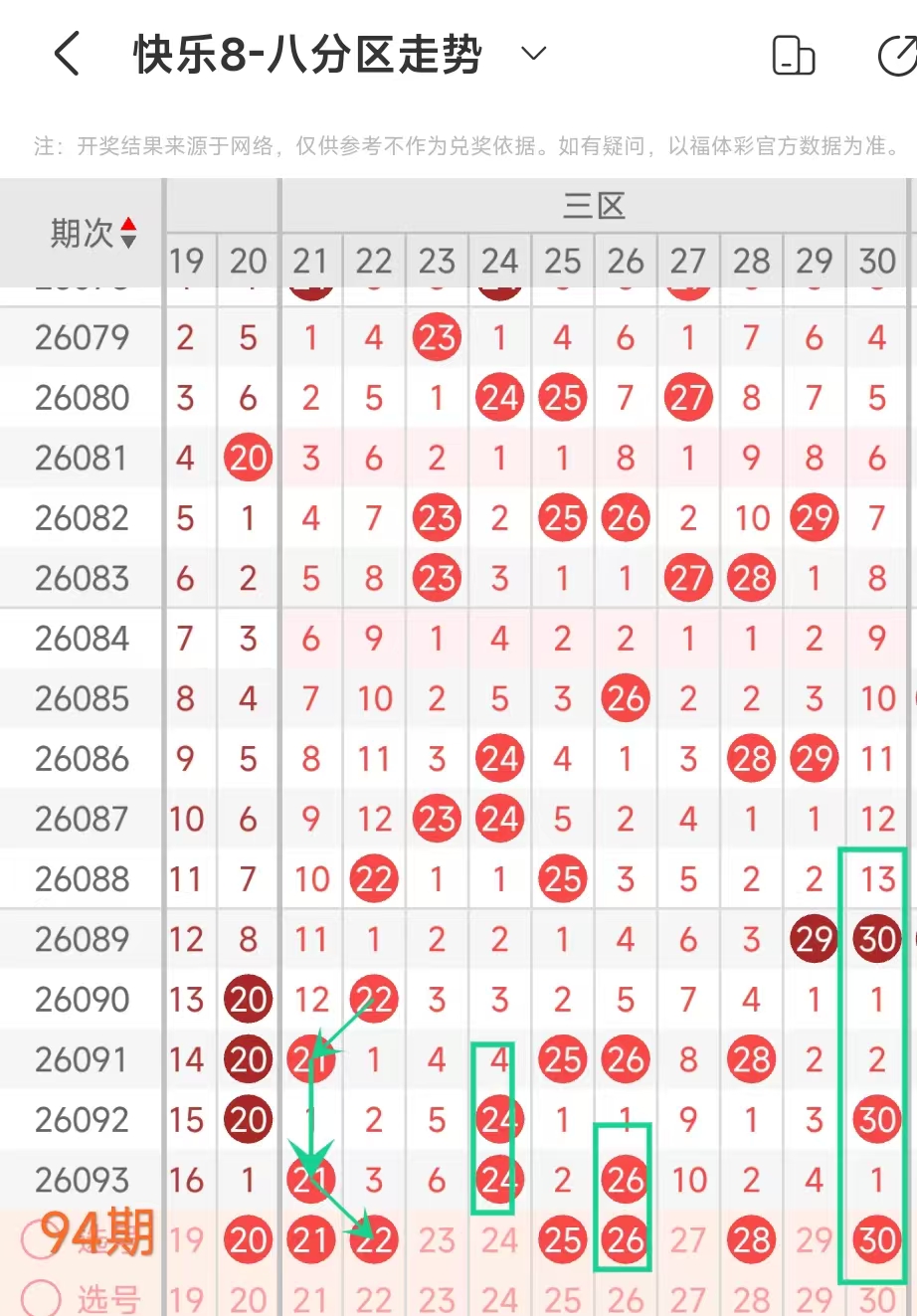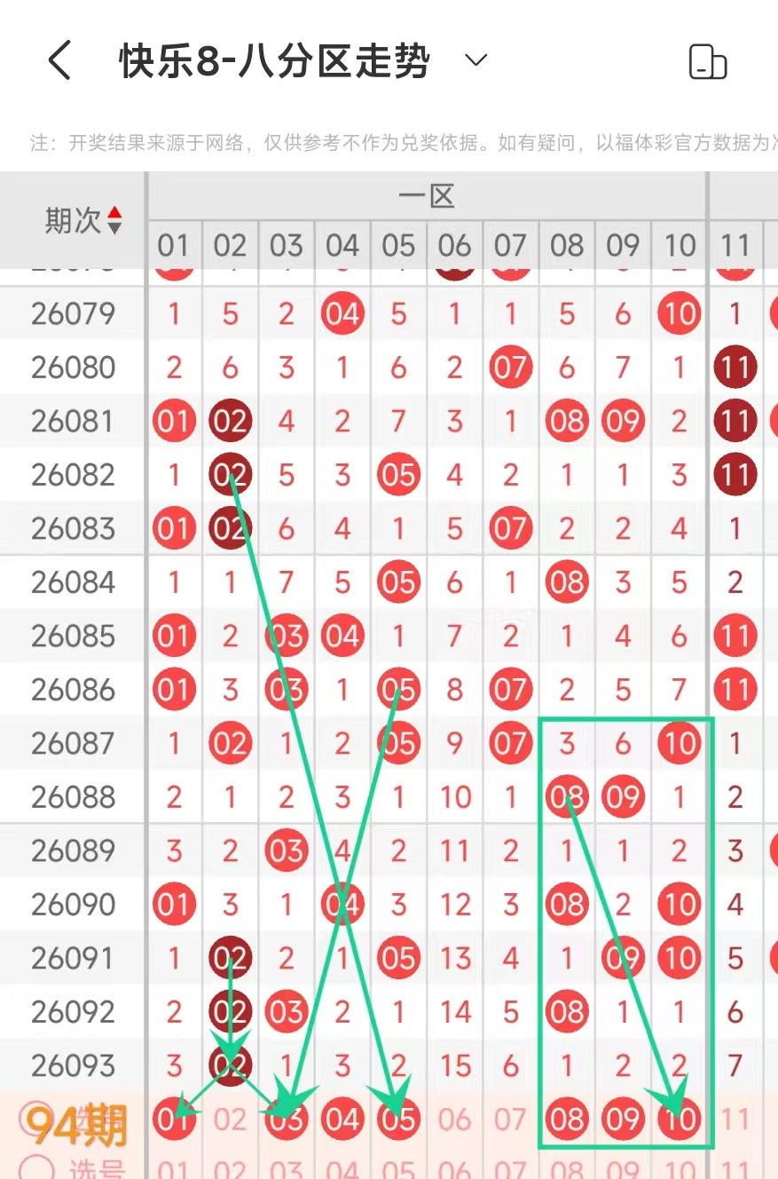 在快乐8的探索之旅中,通过对开奖走势图细致入微的观察,我们总结出一些具有参考价值的规律。几乎每一期开奖号码都呈现出以下显著特征:其一,大概率出现连号;其二,常常伴有边码;其三,遗漏值为1 2 3的号码频繁现身;其四,重号现象也较为常见。掌握这些要点,能为我们的投注提供方向指引。我们约定采用八分区走势图来展开分析。