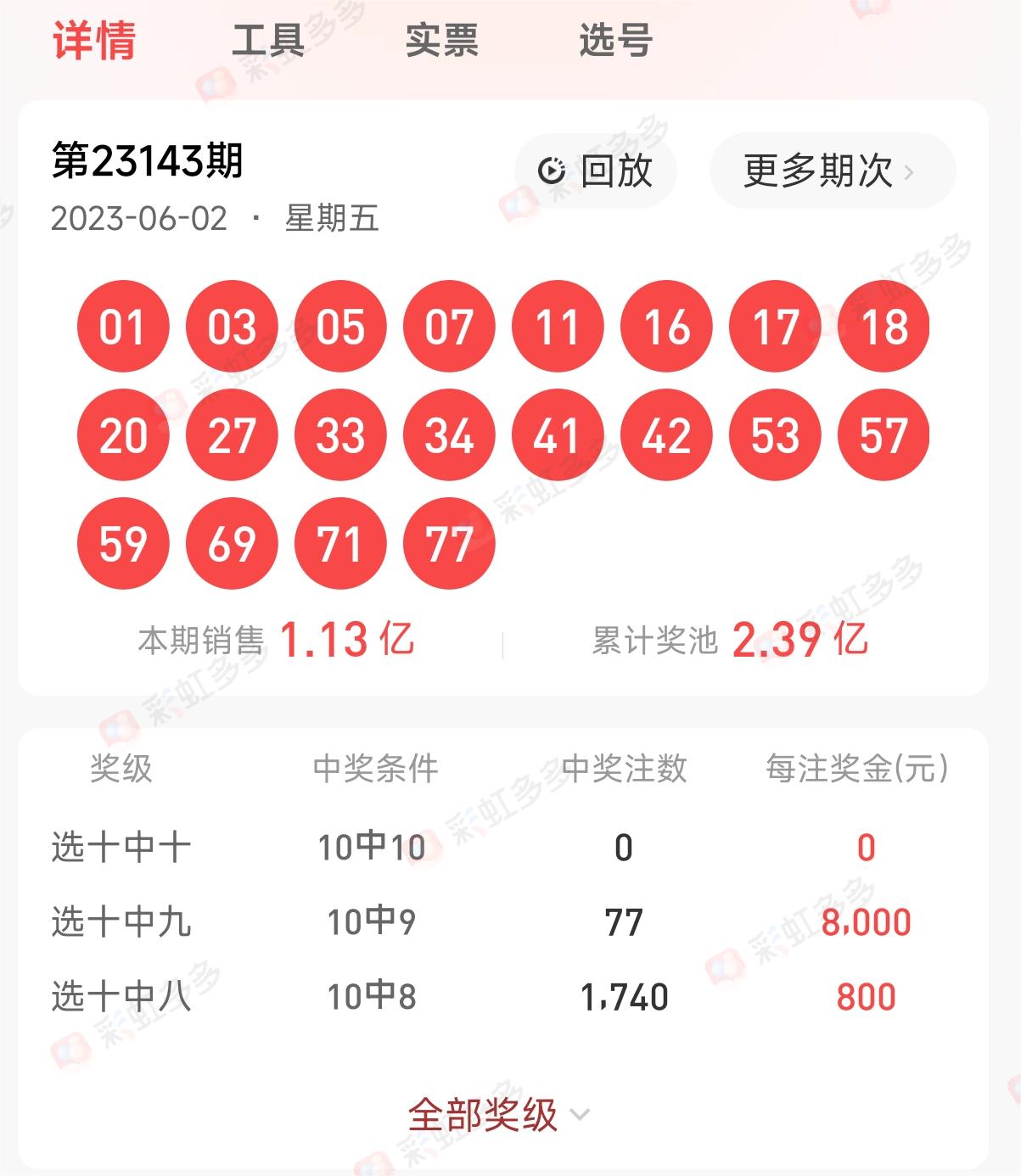 首先回顾上期的开奖号码:01 03 05 07 11 16 17 18 20 27 33 34 41 42 43 57 59 69 71 77