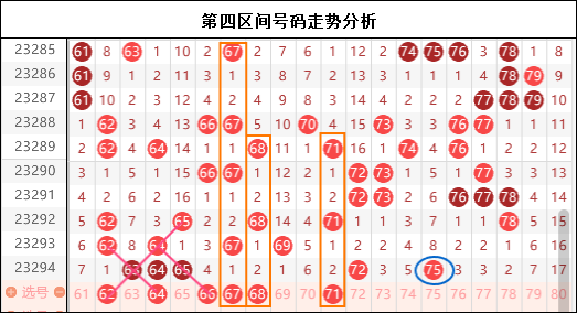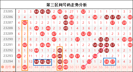 第四区间思路:四区我们想到了连码布局,没想到的是居然联盟的有点过分,不仅两连码出现,三连码直接升级。本期在四区的思路上有点转移的可能是最大的,也就是说四区在整体上开始出现前后互换的走势是本期四区最大的亮点。且整体不家具中的前期热码在本期要重点关注,且连码一样不可少。