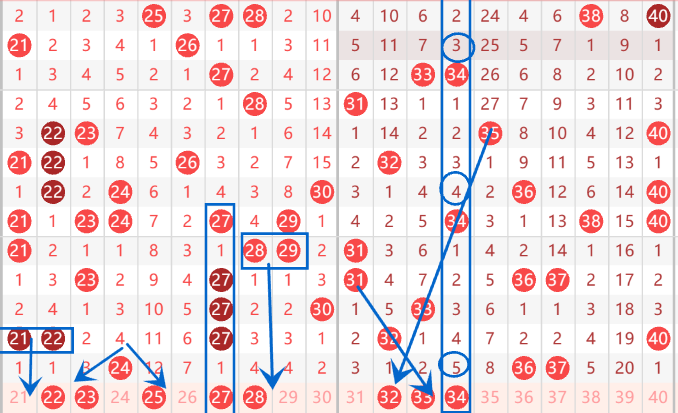 三连号20 21 22上期没能落号下来,本期我们就要注意了,落号机会很大。上期的钻胆24开出来了,那么本期我们就要注意分边的情况。连号28 29已经连续遗漏4期了,本期应该会落一个下来。该区间的34号是属于345走势,可以关注一下。