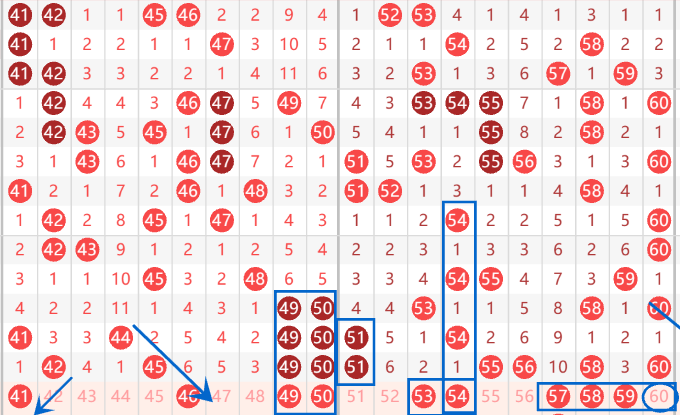 上期开出41 42斜连和44 45斜连,那么本期的43 46我们就要注意了,出一个的可能性还是有的。49 50 51走了3期重号,本期可以防守49 50 51在次开出来的情况。53 54我们还是接着追号了,近期应该还会出一次连号。56 58 60号数字是属于空有3连号出号,所以本期这里我们要重点考虑一下一个重号一个夹号。