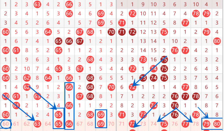 上期的既然开出了65号数字,那么本期的63号数字我们纪要注意了,65本期我们要注意出重号可能。上期开出了68 69号数字,那么本期我们就要注意67 69号数字的出号情况。72号数字是三斜连号,本期可以关注一下。本期我们也是要注意79 80的同出情况,毕竟上期开出了73 76 78号数字,只剩80号数字没有开出来了,所以本期我们可以重点关注一下。