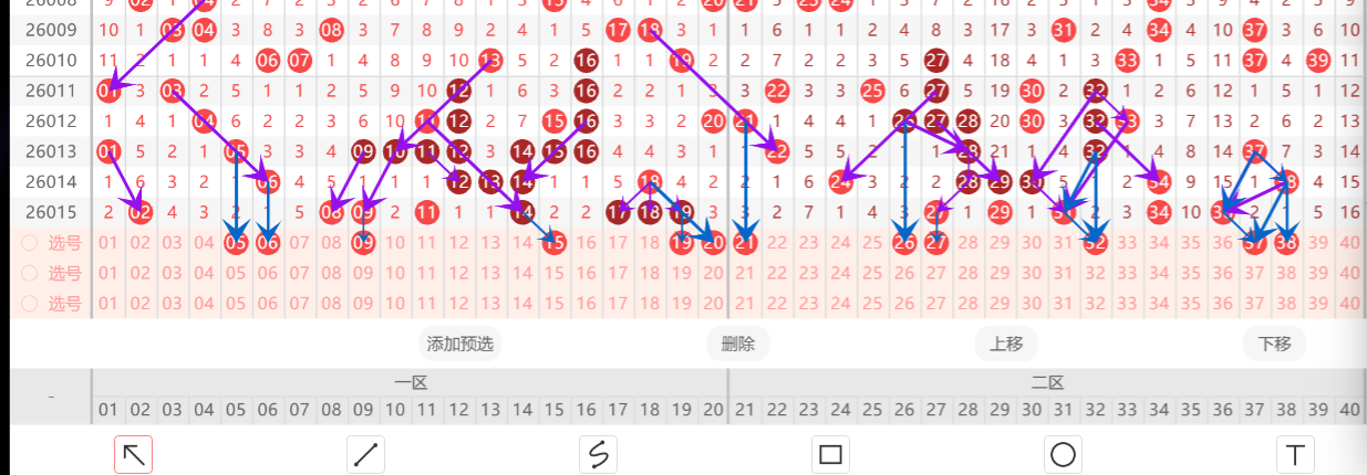 第二:判断第一区间热度会有所下降,注意一些奇数偶数搭配的联动号码,需关注斜连形态的号码。