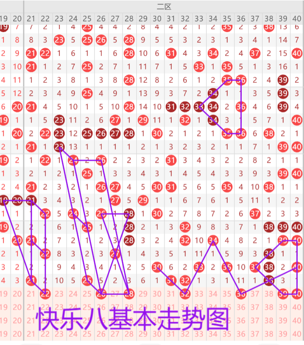 我们来看下二区的基本走势情况,上期开出了五枚开奖号码,本期预计开出4-5枚开奖号码,首先我们来看22的平行三落位号码如图所示。26 28的交叉走势建议二选一。31 32二连堵漏开出重号建议二选一。遗漏11期的唯一号36终点防守。39 40回首掏二连复制如图所示中的35 36形态,优先考虑双码,不考虑单出。