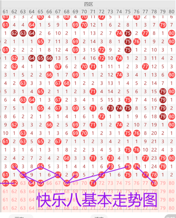我们来看下四区的基本走势情况,上期开出了八枚开奖号码,本期预计开出4-5枚开奖号码,首先我们来看61 63的分边号码首要考虑二选一,并且带上62的空心梅花号做二连形态或者64.62 68 74三个夹号建议三选一。71 74 77的同路三码均为三斜连走势建议三选一或者三选二。78大遗漏优先考虑重号。