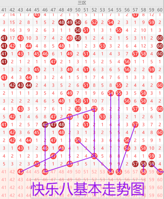 我们没来看下三区的基本走势情况,上期开出了五枚开奖号码,本期预计开出3-4枚开奖号码,首先我们来看43的奇数三斜连走势。46的平行同路三斜连,43 46同路号码建议二选一。54 55双码二连遗漏九期号码建议考虑回补一枚。57 58 59三连号下方重点重号三选一。60的遗漏四分边形态可搭配57 58 59 三选一做选二考虑。