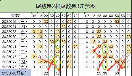 在042期号码42空档1期斜开号码32落在044期上,本期继续这个走势会落在号码22上