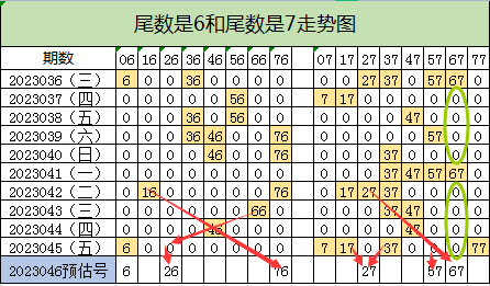 尾数6上期开出1个号码06,这个尾数的号码近10期开出号码个数很少,在本期看到的