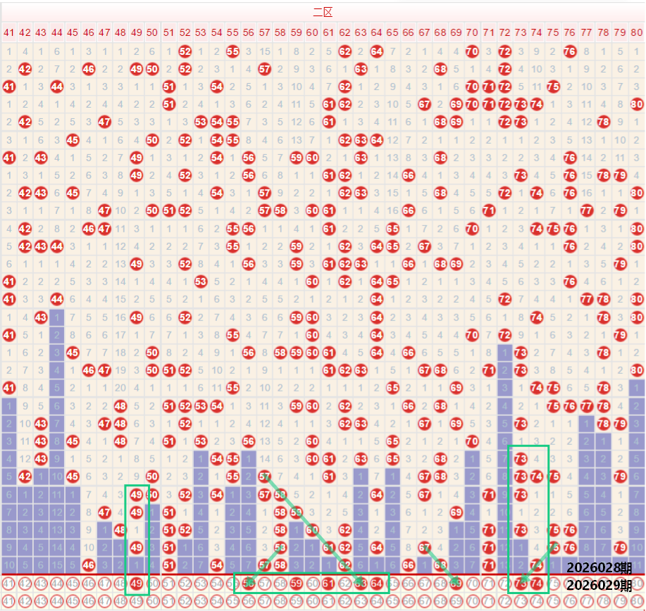 如图所示:在本期大数区的选号中注意在上期的走势中三区间开出了5枚中奖号码,落位在均值走势,其落号形态基本都集中在后半段的位置,前段位置依旧保持着空位走势,另外近期的区间走势中,三区间的落号稳定性最差,在三区间的前段位置目前还未出现补号的情况下,建议还是考虑三区间的号码尽可能的少量选取,在上期开出58的重号第五期走势,并且开出了57形成57 58的二连走势,本期注意56 59的分双边同路双码走势,同时要注意三区间的同尾走势,四区间上期开出了5枚中奖号码,同样也是落位在均值走势,本期注意四区间的落号数量有着较高的概率继续保持在均值或者是均值以上的走势,在上期开出66 68的分双边走势之后,本期注意65 69的单边第三期延续走势,以及上期开出62的重号走势之后,本期建议围绕62的左右继续在考虑多码走势,7字头的号码注意73的边号走势,以及73 74的二连走势,本期要注意的四区间的走势如果落位在均值以上的水平,要注意区间的同尾连号走势。