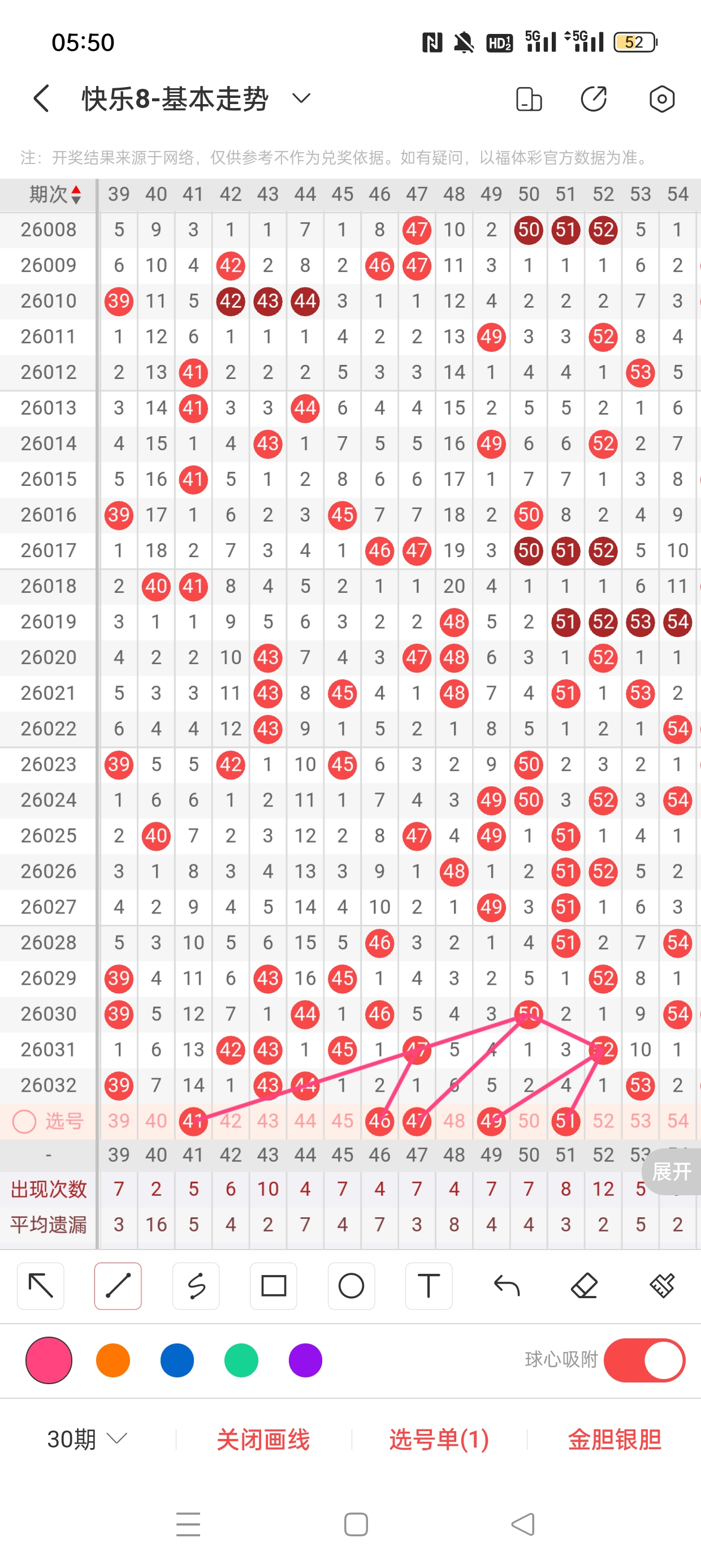 三区(41-60)近五期本区奇偶比27:28,奇数热度高,本期着重偶数。近五期本区和值:216:206:205:203:202,和值下降,本期着重下降,取中间值200,近五期本区区间比:5:4:6:7:5,近两期出号个数为12,本期着重出号个数为5。近五期本区同尾号比值为2,本期着重同尾比值为2。41已遗漏14期,与44之间呈现向左遗漏递减态势,需防。46已遗漏2期,与47之间呈现向左遗漏递减态势,需防。47已遗漏1期,与50之间呈现向左遗漏递减态势,需防。49、51分别遗漏5期、4期,两者与52之间呈现向左遗漏递减态势,需防。