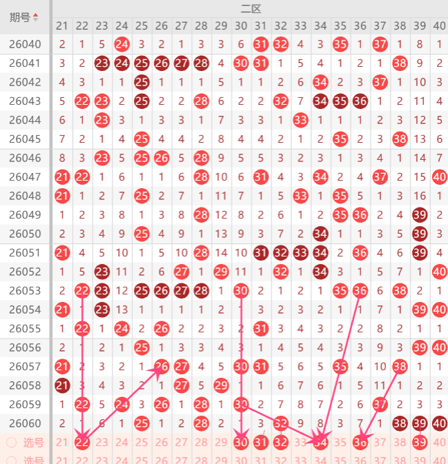 二区间注意打底号21.22.23.30.31.34.35.36.中关注2-3码开出机会,