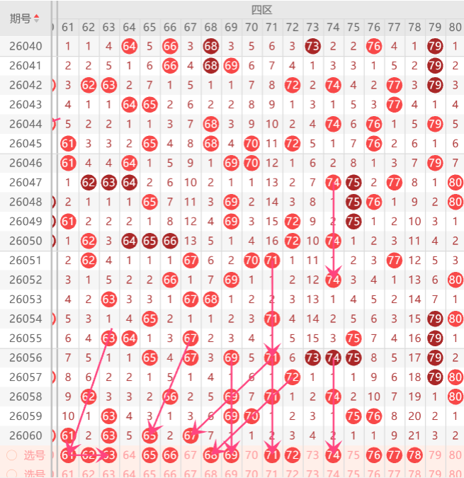 四区在近期的走势上来判断机会的话,整体区间开出走热形态,上期四区间区开出了4码,而且上期区间开出的形态是前半区的空位回补和重码走势,上期小妹在区间布局到了4码开出,那么本期四区间我们重点关注的形态是对称形态,孤码分边,本期首先注意对称形态上的62.68.69.71.72.74.80 中布局1-2码开出机会,而孤码分边上注意防守64.66.68中选择一码分边机会,上期重点关注在孤码分边上开出了2码,上期重点关注在空位回补上开出了2码,那么本期重点关注在对称形态上布局一码订胆机会,如图所示
