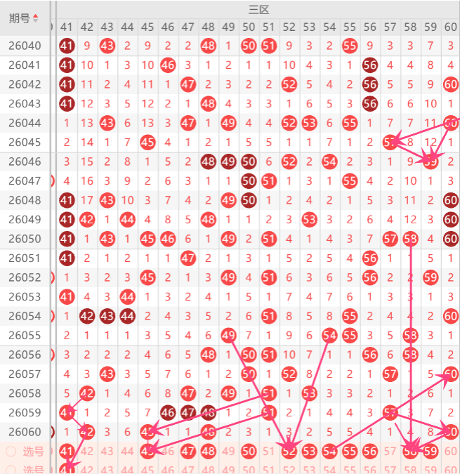 而三区的打底号是45.46.48.49.52.54.56.58.60中参考3-4码开出机会,