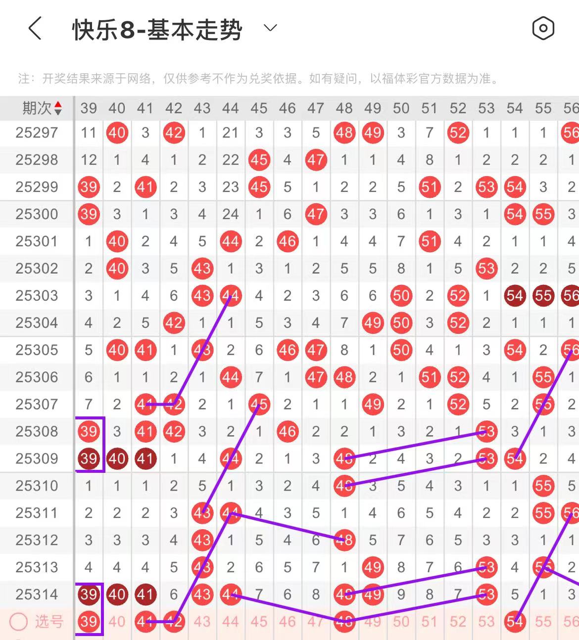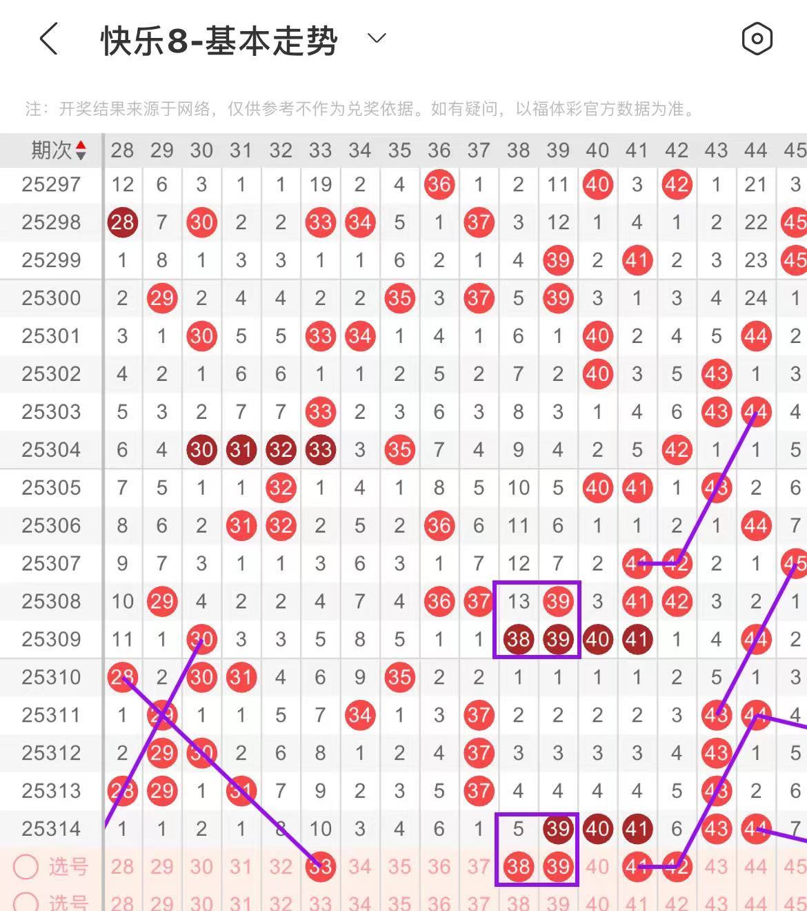 31-40区:本区间上期开出了两个号码,从号码走势图上看,该区现属于温号区,出号个数在两个号码左右。本期有出号走势的号码有33号,假五连出号走势,38.39号,同出形成一个小三角走势形态。