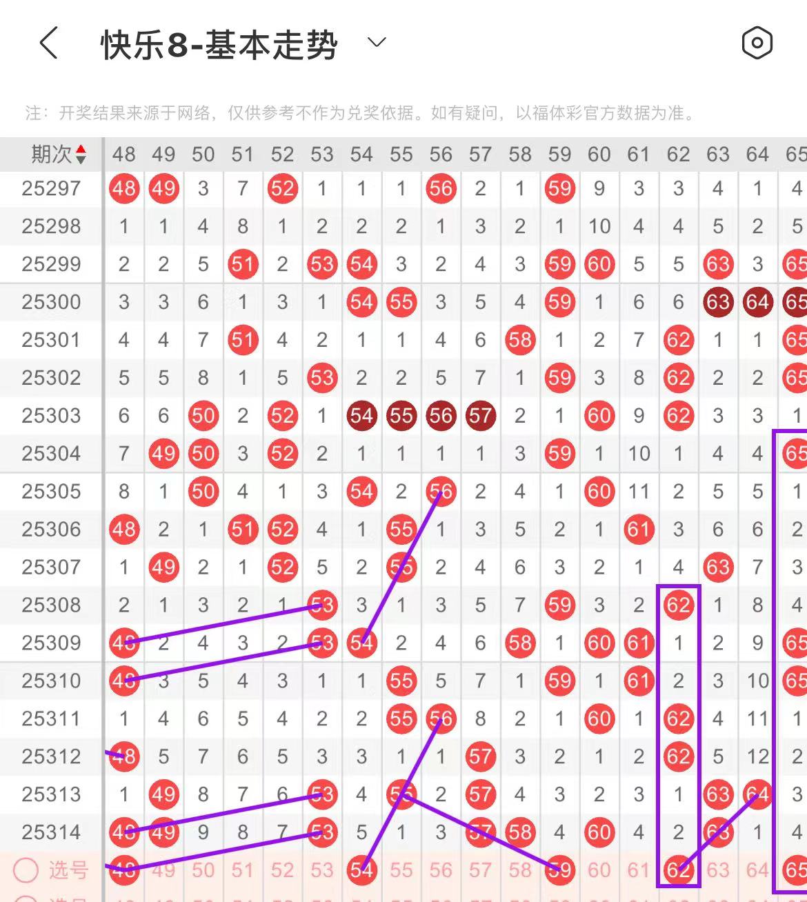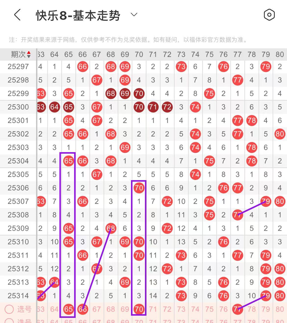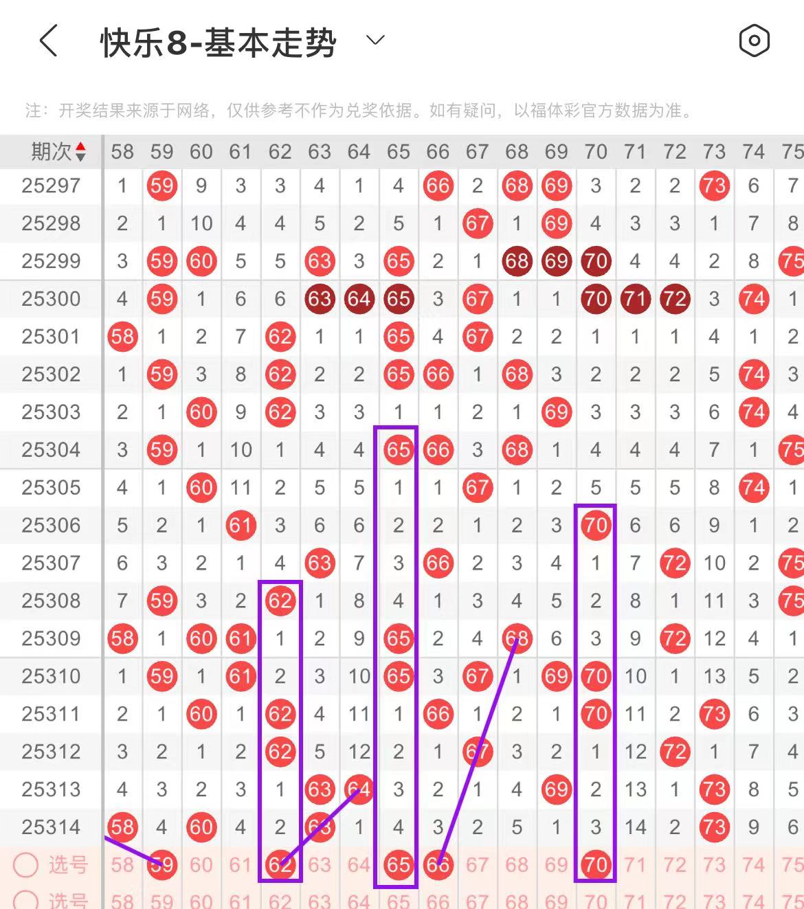 61-70区:本区间上期开出了一个号码,从号码走势图上看,该区现属于温热区,上期出号走势个数减少,本期注意出号个数突增的可能,在选号上可考虑多做选择。本期有出号走势的号码有62号,斜连且上下对称出号走势,66号,斜连出号走势,防65.66同出的可能,70号,上下对称出号走势。