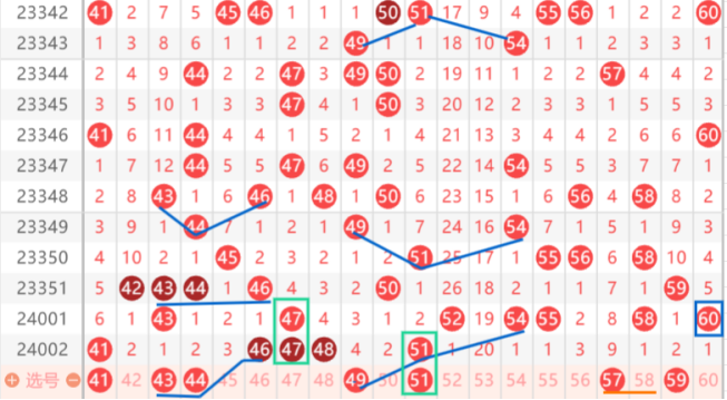 上期三区4字头走热,根据图示近六期3、4、6尾跟随出号两次,本期3、4尾二等于一出号,可重点关注1码;中部关注49、51、54跟随出号,本期49为遗漏跟随号,可布防1码下我,后区位关联二、四区凤尾出号,7、9尾为联动关系热码;