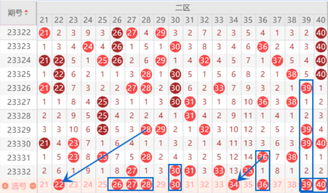 本期的22 23 25号数字我们要注意一下,这里应该会出一个号码的,我们需要关注一下。本期的26号数字是属于三斜连号码,可以防守一下26 27号数字同出的情况。本期的29号数字我们可以防守一下,出号机会还是会有的。上期开出了30 31 33 35号数字,本期这里我们要注意出一个重号一个夹号的情况,可以关注一下30 34号数的出号情况。本期的39 40号数字我们要注意落下号码的情况,尤其是39号数字是属于空二对称。