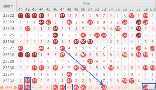 本期的41号数字我们可以关注一下,出号机会还是有的,可以防守一下41 42同出的情况。本期的47号数字我们也是要重点关注的,属于空四对称号码,出号机会很大。连号49 50号数字我们也是要注意落下一个号码的情况。连号52 53本期我们可以防守一下落下一个号码的情况,本期不落那么下一期落号的概率就很大了。连号59 60号数字本期我们也是要注意落下一个号码的情况,重点关注一下59号数字的出号情况。