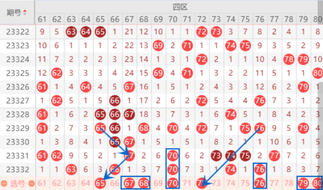 该区间的65号数字我们关注一下,属于V型号码,出号机会还是很大的。本期的68 72号数字都是属于空三中心号,有机会出一个号码的,这里我们需要注意一下。本期的70号数字我们需要注意一下出三重的情况。本期我们防守一下76 79号数字同出或者79 80号数字同出的情况就行了。