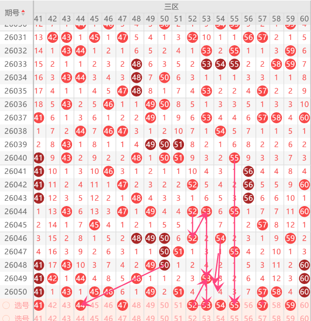 而三区的打底号是43.49.52.53.54.55.57.59中参考2-3码开出机会,