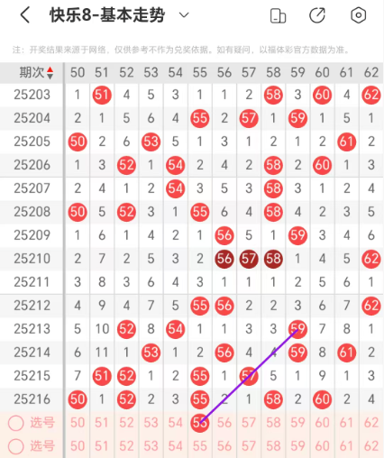 55码,如上图所示,与往期奖号57 59码形成一个隔1的斜3连,所以看好。