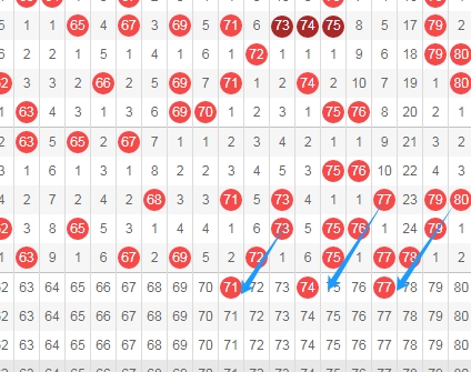 上图是福彩快乐8开奖号码走势分布图其中一部分,我在上面标注出来的数字71 74 77都是斜连号码,数字71是从数字73一直斜连下来,数字74一直从数字77斜连下来,数字77一直从数字80斜连下来,福彩快乐8出斜连号码也是出现的比较多的,所以大家也要留意斜连号码。