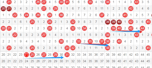 上图是福彩快乐8开奖号码走势分布图其中一部分,我在上面标注出来的数字24 25 27 29 31这里组成的图像我用蓝色横向箭头标注出来了,上面也标注出两个蓝色横向箭头,你们仔细看看这些蓝色横向箭头里面的数字的图形是不是很相似呢?通常就是根据最近开奖号码特点去选择号码,那么你们觉得24 25 27 29 31可以不?
