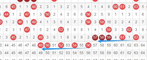 上图是福彩快乐8开奖号码走势分布图其中一部分,我在上面标注出来的数字一共有11个,这11个数字上期只开出了一个数字49,最近两期这个区域也只出现了3个数字,最近几期这个区域出号码也不是很多,那么本期这个区域出号码也是有机会的,本期关注这个区域的数字出3个或者4个吧。