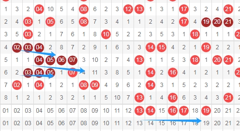 上图是福彩快乐8开奖号码走势分布图其中一部分,我在上面标注出来的数字13 14 16 17 19这几个数字是根据左边上面蓝色箭头那里的特点选的号码,那么你们看看这些蓝色横向箭头标注出来的地方是不是也有相似的地方呢?那么数字13 14 16 17 19可以考虑考虑出3个或者4个。
