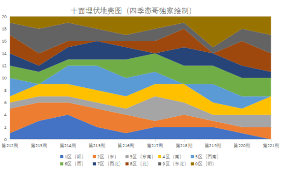 近十期走出了1-3-4-2-1-2-2-2-1-0走势,根据我前面对一区的解释,说明这个区是很有规律的。