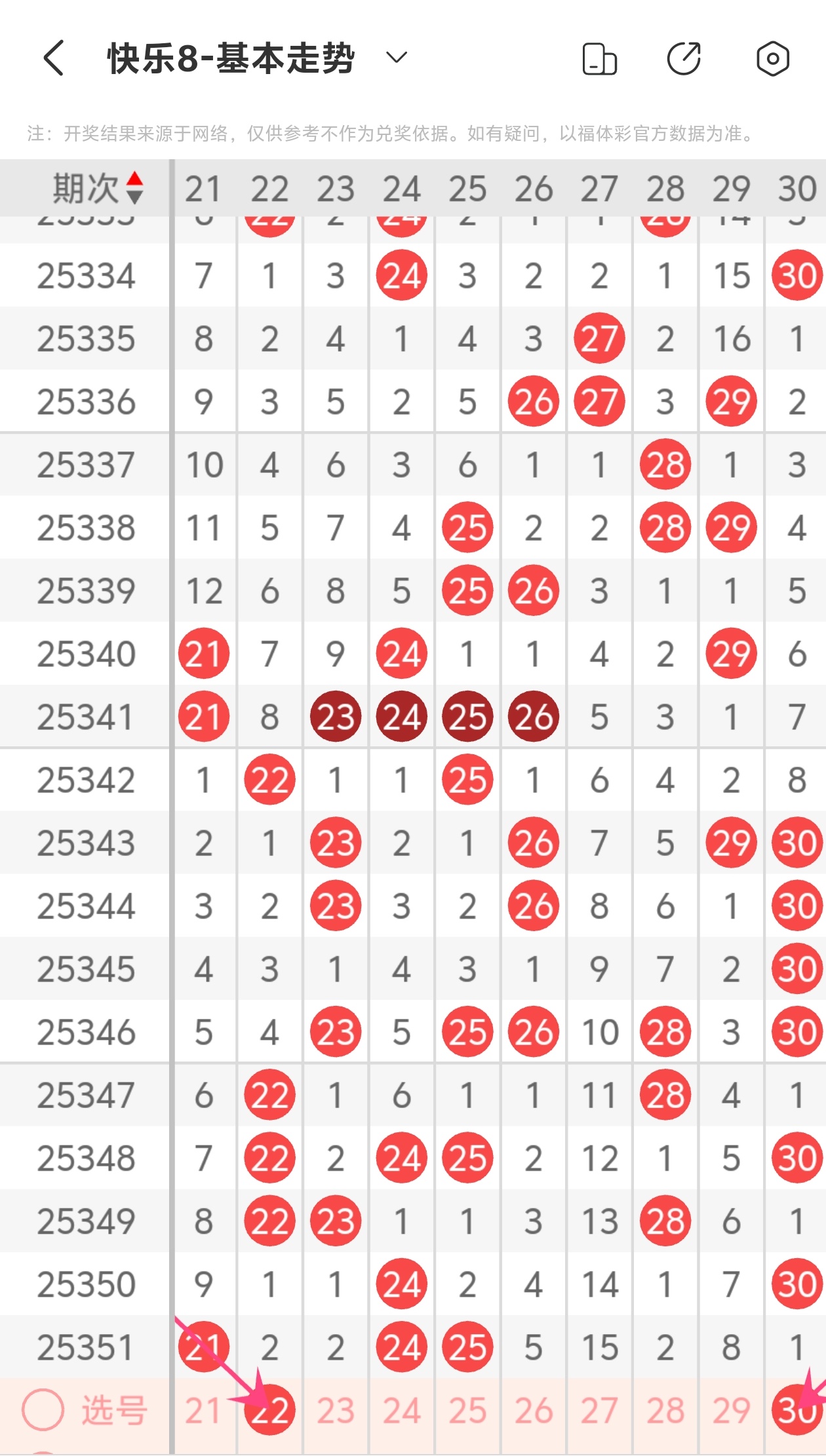上期第三区间开出21 24 25,22为斜连走势,30为斜连走势,本期推荐22 30