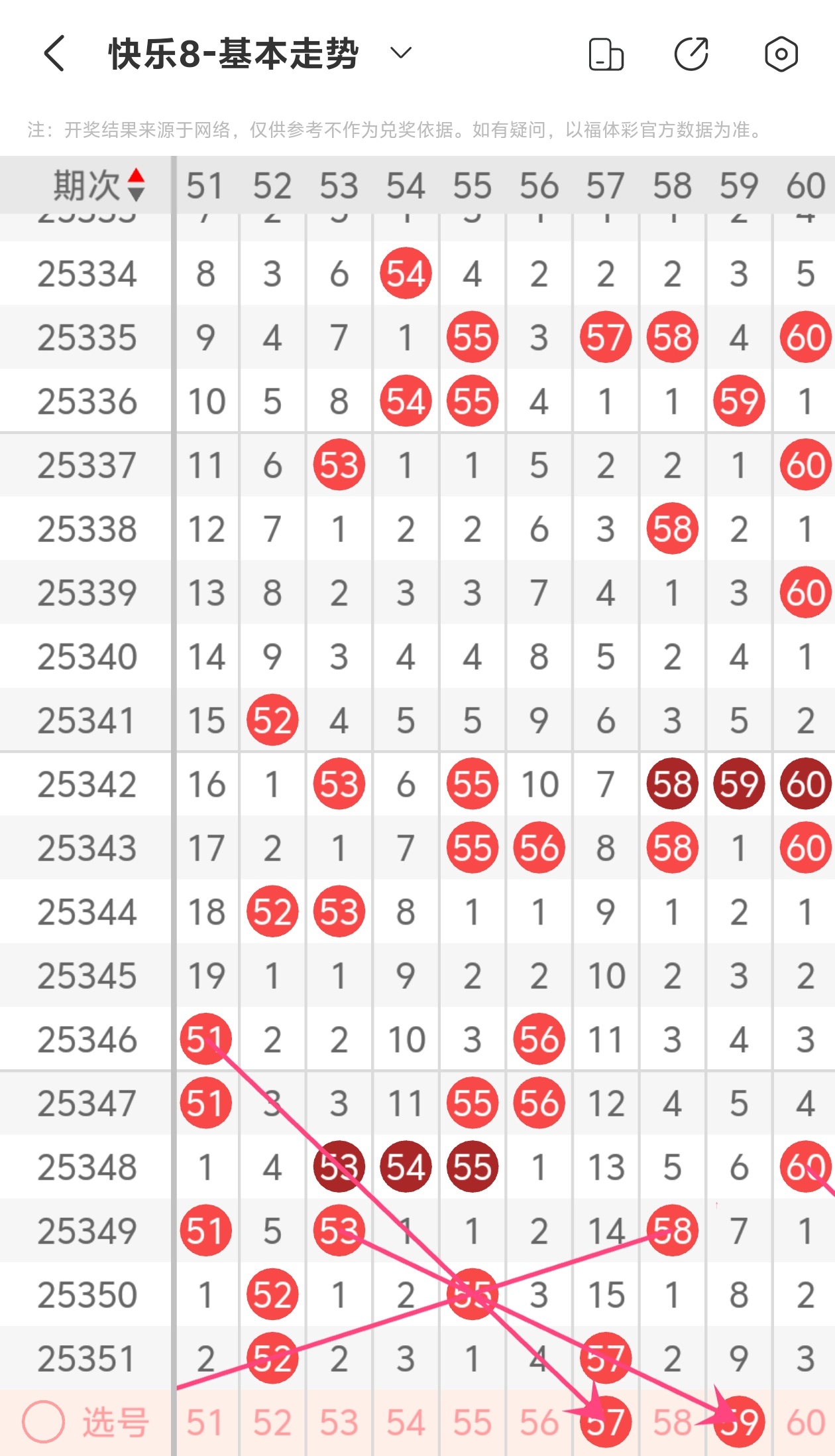 上期第六区间开出52 57,57为斜连走势,59为斜连走势,本期推荐57 59