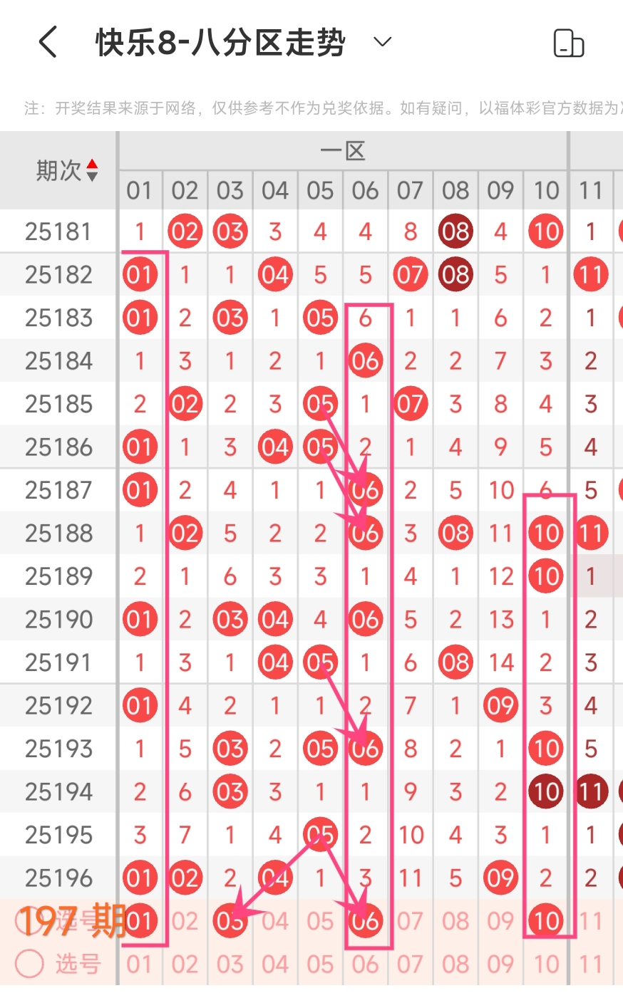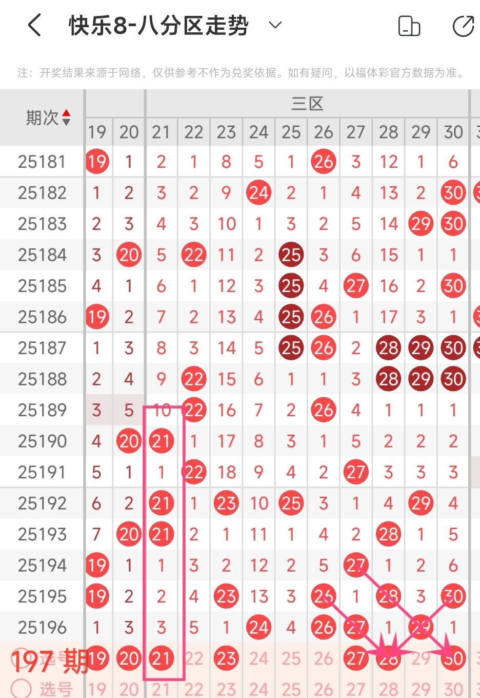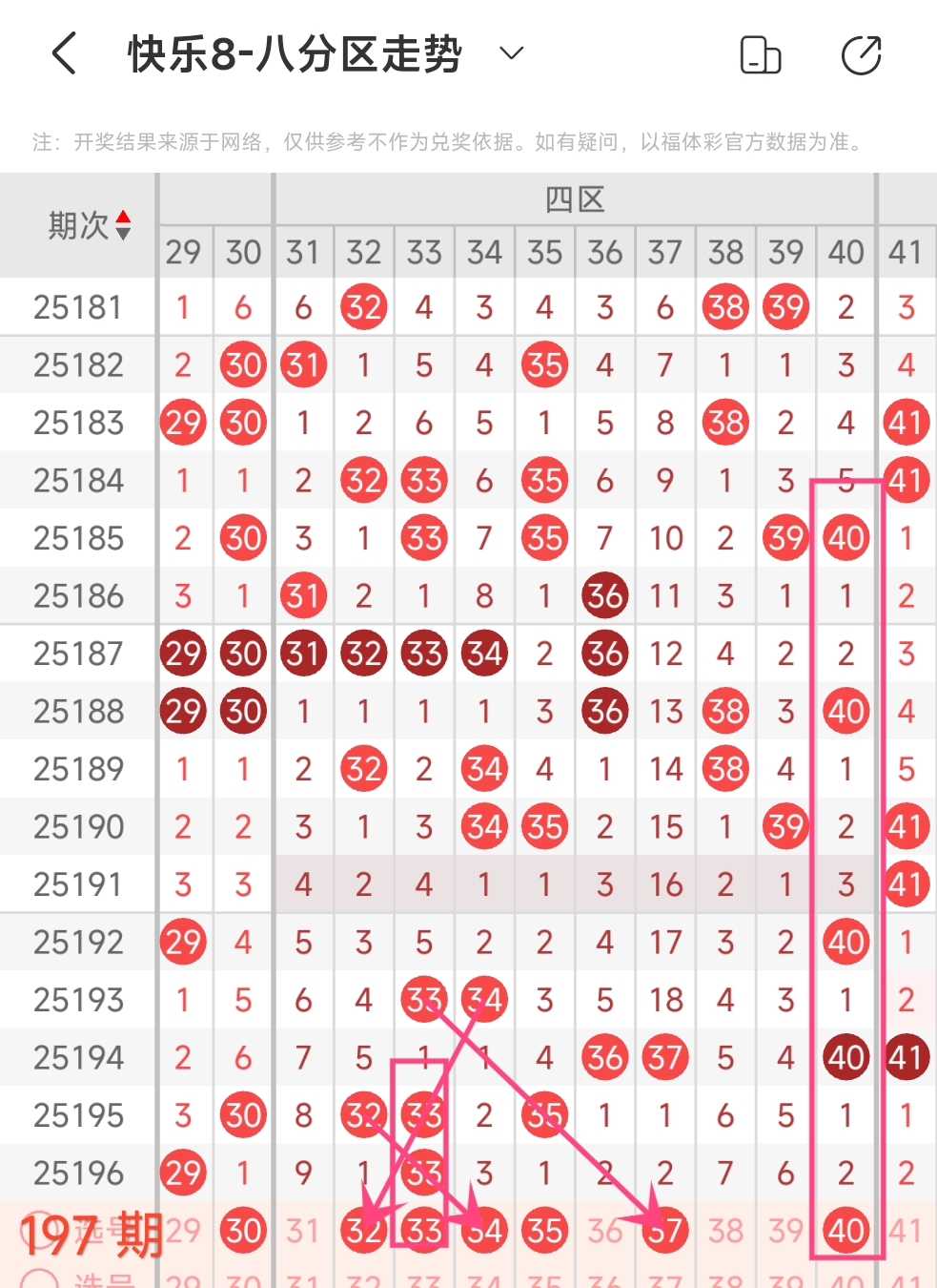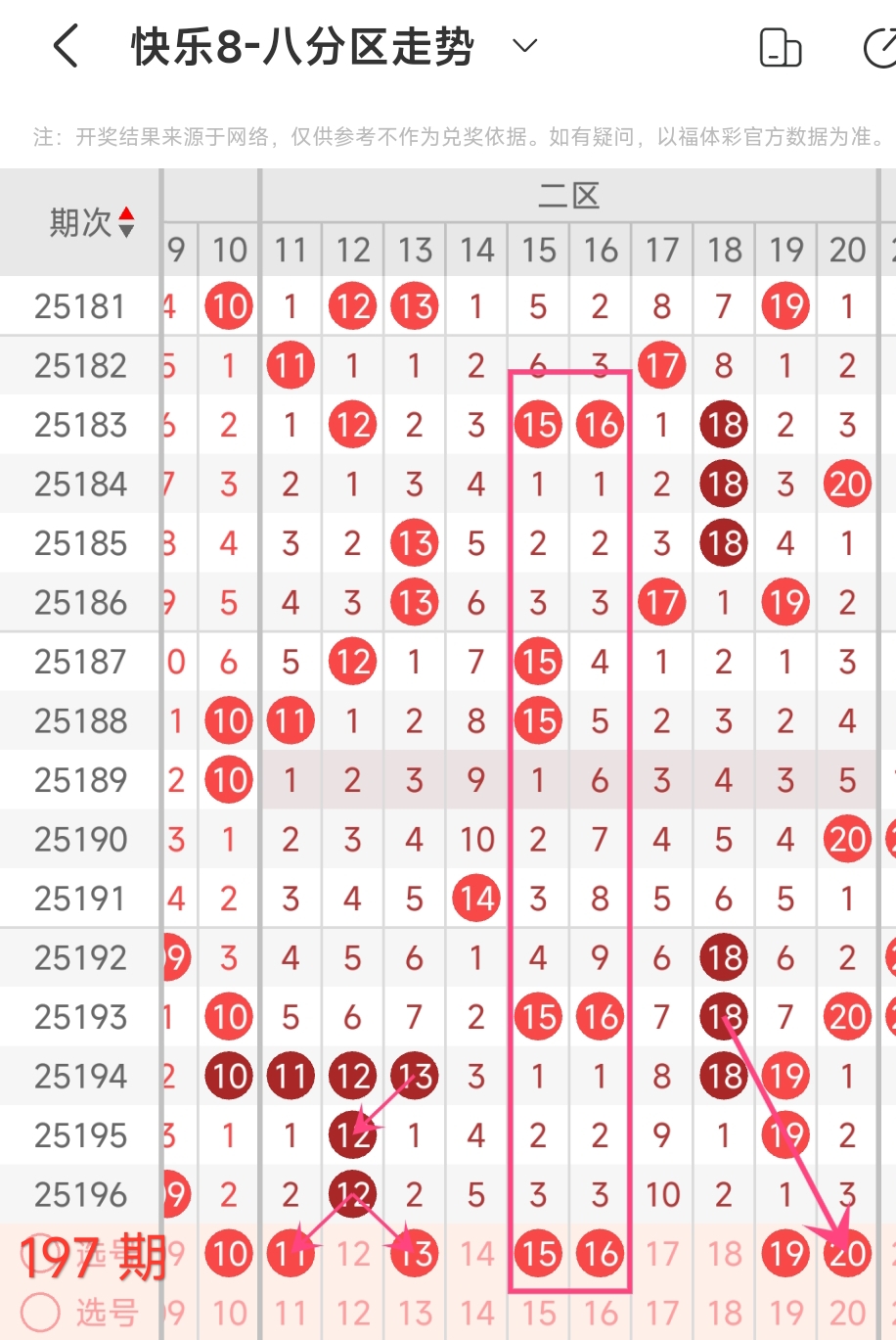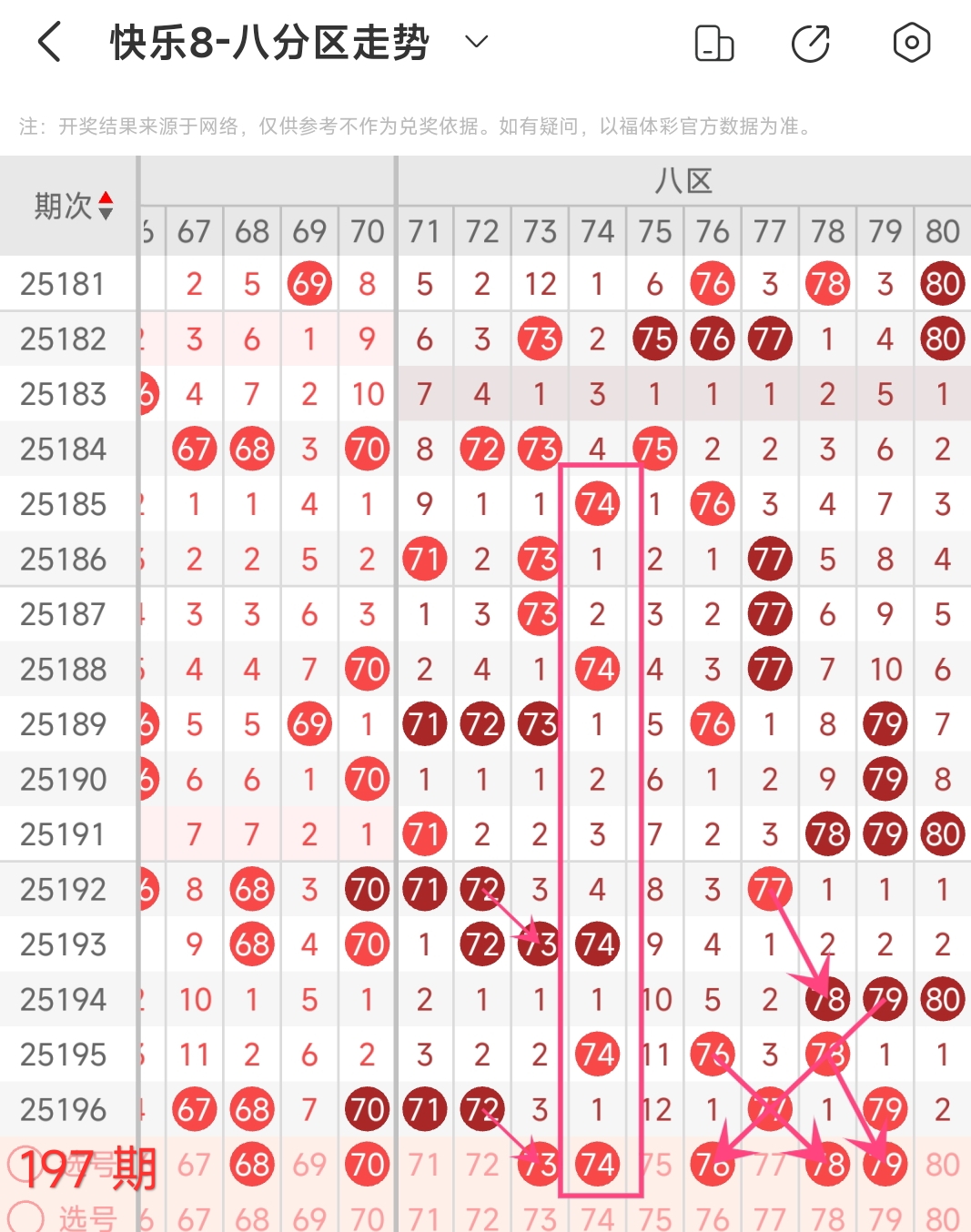 在快乐8的探索之旅中,通过对开奖走势图细致入微的观察,我们总结出一些具有参考价值的规律。几乎每一期开奖号码都呈现出以下显著特征:其一,大概率出现连号;其二,常常伴有边码;其三,遗漏值为1 2 3的号码频繁现身;其四,重号现象也较为常见。掌握这些要点,能为我们的投注提供方向指引。我们约定采用八分区走势图来展开分析。
