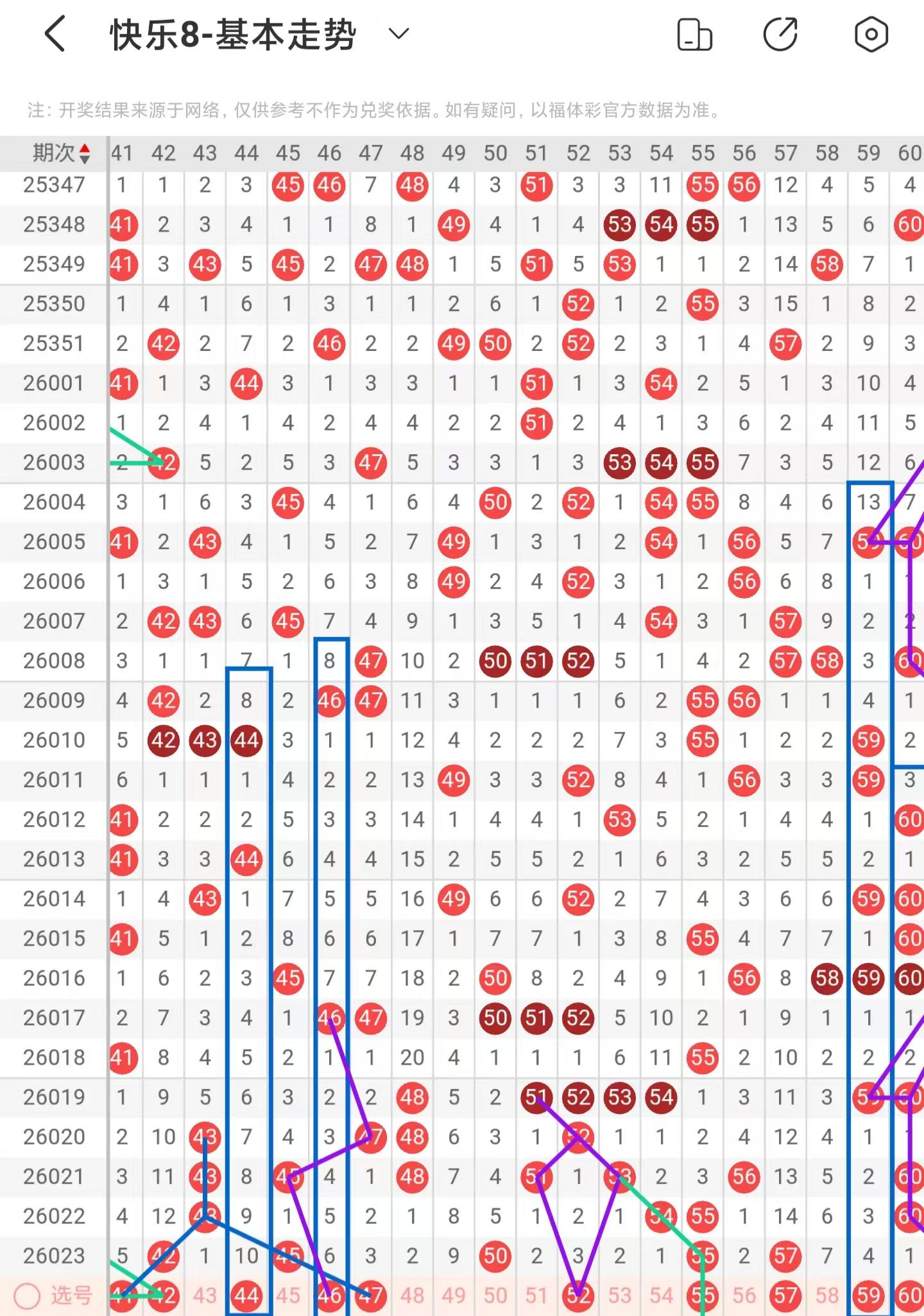 三区间上期稳定落号,一共开出五个号码球,本期考虑等同数量的号码球,注意直连转斜连走势的41、47号码球,注意期数和值加减法的44号码球,注意隔期递减的46号码球,同时也是百期相似形态号码,注意期数和值加减法的52号码球,同时也是近期相似形态号码球,注意斜连转直连走势的55号码球,以及重落回补的57号码球,注意期数和值加减法的59、60号码球,注意近期59、60、61号码球的走势相似,本期注意59号码球,因此三区间关注41-46-52-55-60,注意本区间的选二复式46-52-60。