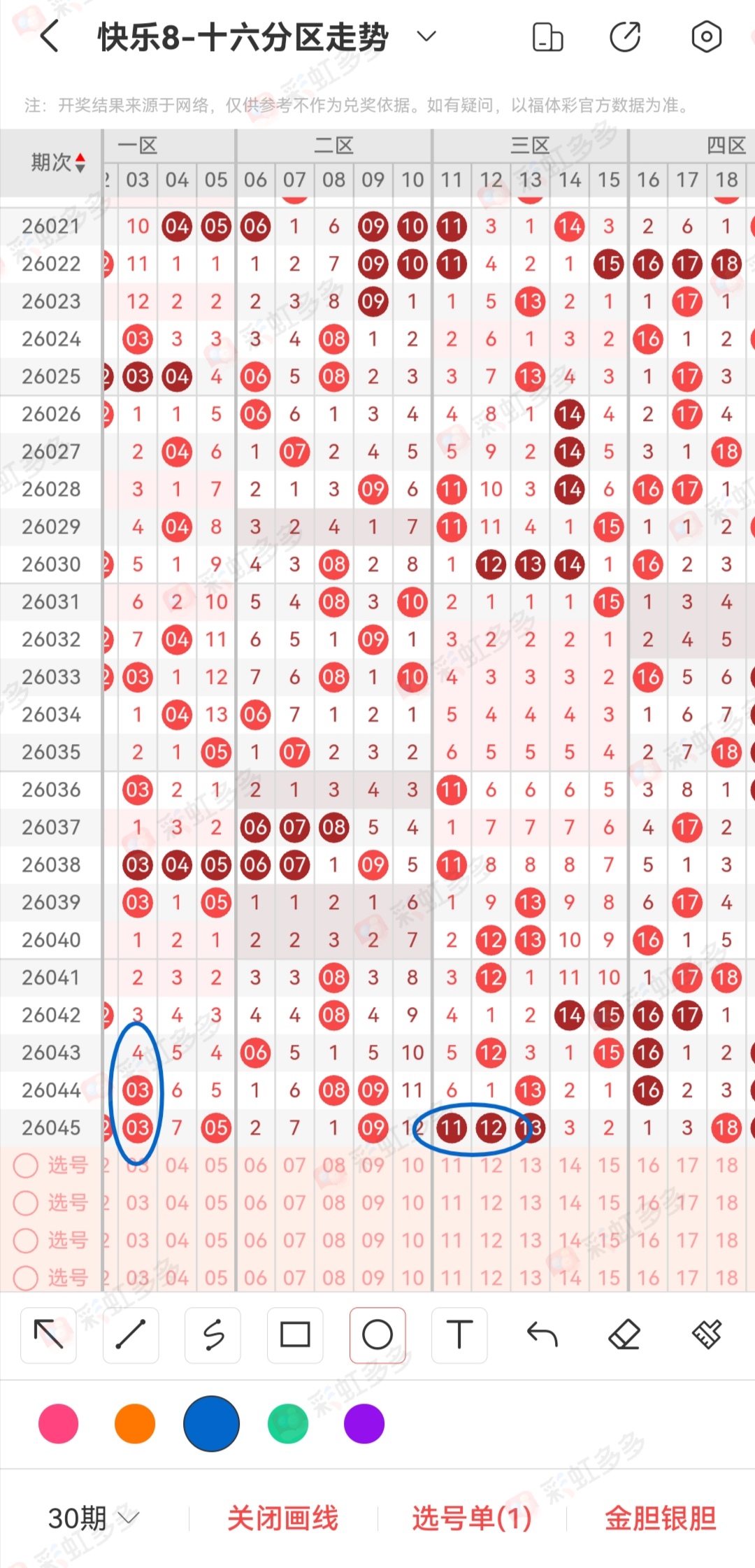 今天的号码推荐没有什么值得重点的,最近也不知道是怎么回事,每天玩快乐8有种不一样的感觉。一开始看到特殊的规律是那种欣喜若狂的,后面好像这种情绪不会出现了。是没中奖还是说十次有九次都是错的。说被打击过,但是看整体,每年都能赢一点。10万20万很平常。这到底是怎么回事。号码发现的多了,规律到底有没有存在,极端化,有的人认为没有,有人认为有的。我是认为那种有的一类,号码可能存在狭义,短期内存在的规律到底是不是规律。或者说,玩快乐8到底是个游戏还是希望。这个对错好像无关紧要。很多次都是这种说法,看到的号码没有打就偏偏能出,打了的号码或者说分享出自己认为最热的状态,恰巧一个没有,反而自己认为比较大胆的号码能够开出。直播了两年,这两年什么样的规律没有发现,很多奇葩的类型也有遇到。特殊的点位也有备注。号码是很亲密,敏感度也是存在的。这种心情落差竟然存在。上面是突然出现的情绪。我们还是回到号码分析里面,第一张图这里有两个结论,或者说这里有两个突出的点位。首先03,这里也是第一次出现我们之前存在过两次总结,第一03通常和4期遗漏同出,第二03走重没有同4期遗漏同出第二天如果有夹号是4期遗漏的可以定胆。第三就是今天这种状态,4期遗漏是自身,且出现03走重,这里的延伸没有想法。有可能说今天的4期遗漏1个没有或者说全开。这里就是极端思维。所以建议单挑所有的4期遗漏。至于03会不会有3重没有想法。第二个点就是11 12同出,之前的结论有两个,第一11-20存在号码走重大方向,第二不走重出现空区(极少),第三就是不空区不走重。这里也没有一个固定的解题,或者说09 54在明天能出。这里就是第一张图分析,其实这里如果没有大方向可以直接全丢。