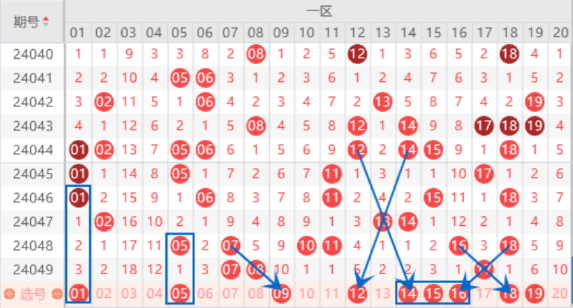 该区间的01号数字我们注意一下出号情况,属于乱序号码走势,出号机会还是有的。本期的05号数字是属于3221走势,出号机会也是有的,可以防守一下。本期的09 20号数字是属于遗漏10期的号码,本期我们注意一下出一个号码的情况。12 14号数字是属于交叉对称号码,本期是有机会出一个号码的,我们要重点关注一下。本期的16 18号数字也是要交叉对称号码,本期可以做一下防守,本期不出我们就等到遗漏4期的时候在来做号吧。