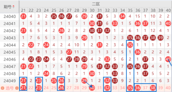 该区间上期开出了21 23 25 26号数字,本期我们注意一下出重号的情况,重点关注一下23 26号数字出重号的情况就行了。本期的30号数字我们关注一下出号情况。连号32 33号数字我们注意一下出一个重号的情况,重点关注一下32号数字走重的情况。本期的35号数字是属于空二对称号码,又是属于空三中心号回补,所以出号机会还是有的,我们要注意一下。本期的36 37 38号数字是有机会出一个号码的,我们重点关注一下36 38号数字的出号机会就行了。