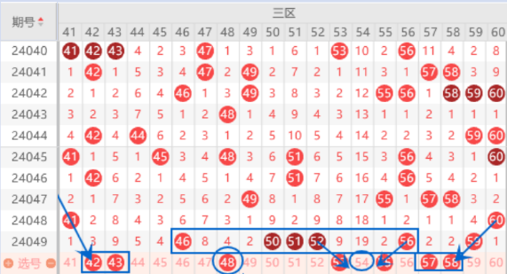 本期的43号数字是属于遗漏9期的号码,本期遗漏9期的号码也是有4个,本期我们要注意出一个号码的情况。本期的48 54号数字是属于空三中心号码,由于上期没能开出了,本期是有机会来出一个来了,我们重点关注一下48号数字的出号情况就行了。上期开出了50 51 52号数字的三连号,本期我们注意一下出重号的情况,重点关注一下50号数字出重的情况。本期的55号数字我们注意一下出号情况,属于242走势,出号机会还是有的。