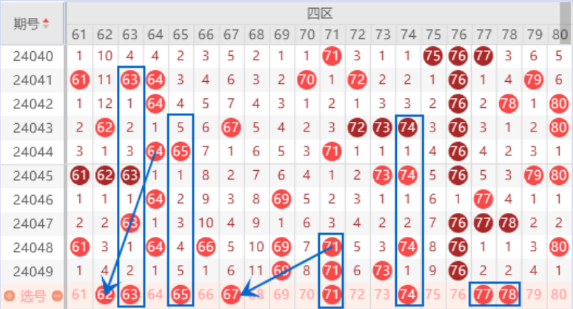 本期的62号数字我们注意一下出号情况,属于三斜连号码,可以防守一下62 63号数字同出的情况。本期的65号数字空五对称号码,出号机会还是有的。本期的71号数字我们注意一下走三重的情况。74 80号数字是属于121走势,上期的121走势号码都没有出来,本期我们防守一下出一个号码的情况。